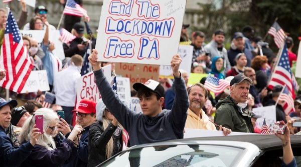 The incessant clang of car horns rang out in the US state of Pennsylvania Monday as hundreds of vehicles circled the Capitol building in a protest against confinement measures aimed