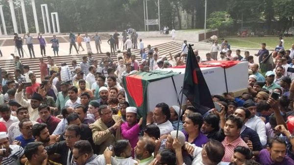The mortal remains of the BNP vice-chairman was taken to the Shaheed Minar at 12:10pm after a namaz-e-janaza at the south plaza of Parliament.
